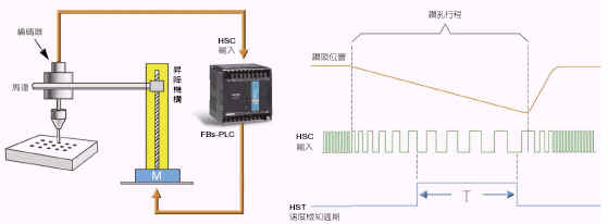 FBs-PLC所特有之0.1mS時(shí)基之高速定時(shí)器提供時(shí)基誤差僅0.1mS之定時(shí)器及計時(shí)到(time-up)之實(shí)時(shí)中斷處理功能,相較一般PLC最低 1mS時(shí)基加上掃描時(shí)間之誤差,其精度為數十倍以上。在許多過(guò)去PLC無(wú)法勝任之精密計時(shí)或速度檢知之應用場(chǎng)合,FBs-PLC均可勝任。FBs-PLC 有一組16位之0.1mS之HST,而4個(gè)32位硬件高速計數器((HHSC)均設有軟件開(kāi)關(guān),可個(gè)別轉換至SoC芯片內部之0.1mS時(shí)基而變?yōu)?2位之HST,因此最多可有4個(gè)32位之HST。