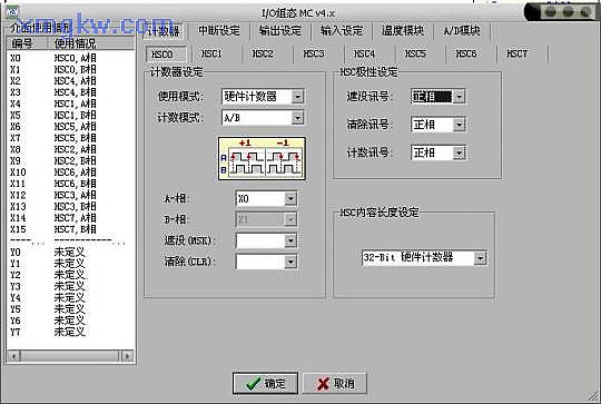 (1) 主機具備4個(gè)200kHz的硬件高速計數器(HHSC)和4個(gè)頻率總和為5kHz的軟件高速計數器(SHSC),無(wú)需另加高速計數模塊即可滿(mǎn)足系統需求。軟件高速計數器支持U/D,P/R,A/B三種計數模式,硬件高速計數器更是支持U/D*2, P/R*2, A/B*2,A/B*3, A/B*4,共計8種計數模式。