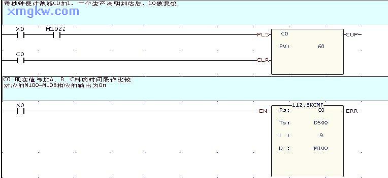 ? 所謂絕對凸輪控制,是指計數器 C現在值在設置的一段絕對時(shí)間段內,對應輸出裝置會(huì ) ON,多個(gè) M 裝置可能同時(shí)為 ON。本例中, C0現在值與 9段設置絕對時(shí)間段( D500~D517)進(jìn)行比較,在這些設置時(shí)間段內,對應的 M100~M108 中的裝置狀態(tài)輸出為 ON。 z在BKCMP指令被執行前,也可用 MOV指令預先將各設置值寫(xiě)入到 D500~D517中。C0當前值所屬范圍 | 輸出裝置 |