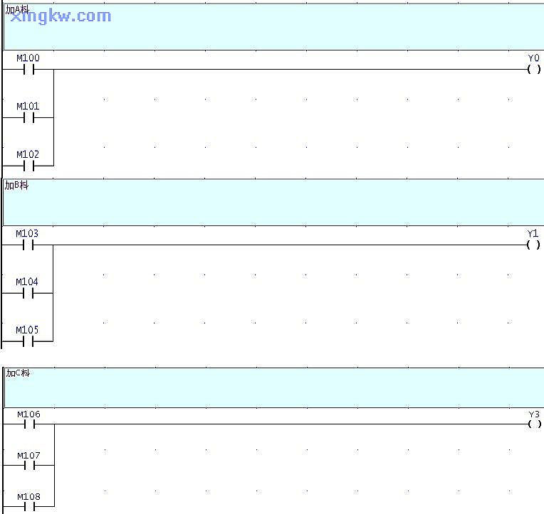 【控制要求】生產(chǎn)某種產(chǎn)品需 A、B、C三種原料, 1個(gè)生產(chǎn)周期為 60秒,這些原料需在生產(chǎn)周期適當時(shí)間段加入。要求在生產(chǎn)周期的 10秒~20秒,30~40秒,50秒~55秒期間加入 A原料;在生產(chǎn)周期的 0秒~10秒,20~25秒, 40秒~50秒期間加入 B原料;在生產(chǎn)周期的 20秒~25秒,30~35秒,40秒~45秒期間加入 C原料。