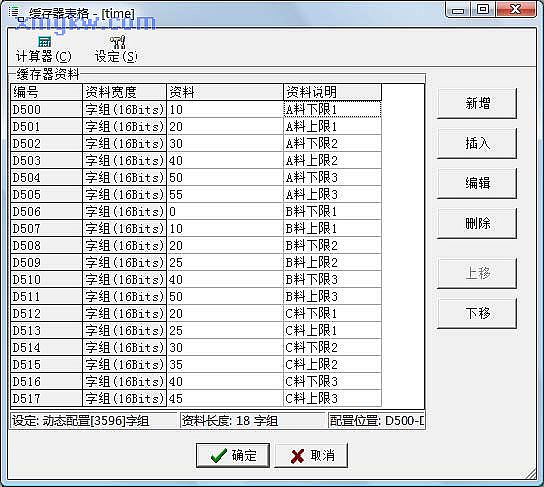 【控制程序】首先將各種原料加入的下限、上限時(shí)間設定在緩存器表格中,如下圖: