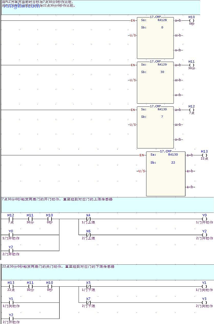PLC萬(wàn)年歷當前時(shí)間與設定時(shí)間,實(shí)現倉庫門(mén)自動(dòng)控制功能。其中程序行 N000~N003為比較指令,若把設定值存放在緩存器中,結合人機界面,即可隨意把任意時(shí)間值(精確到秒)設定為倉庫門(mén)開(kāi)閉時(shí)刻。