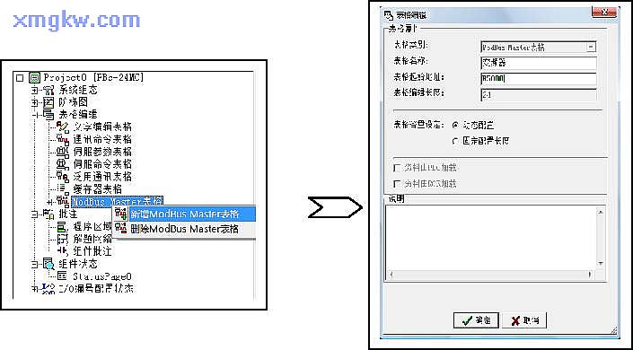 【ModBus Master表格的編輯】方法1:點(diǎn)選菜單欄的“專(zhuān)案” ?“ModBus Master表格” ?“新增ModBus Master表格”。方法2:在專(zhuān)案管理窗口,展開(kāi)“表格編輯”,右鍵單擊“ ModBus Master表格” ?“增加 ModBus Master表格”,如下圖所示。方法3:鼠標左鍵單擊梯形圖中的 FUN150指令,按鍵盤(pán)“ Z”,彈出“表格編輯”對話(huà)框 。