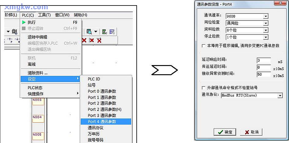 【PLC通訊參數設置】點(diǎn)選菜單欄的“ PLC” ?“設定”?“Port4通訊參數”,通訊協(xié)議選用 ModBus RTU(Slave),通訊格式為 9600,E,8,1。如下圖所示:
