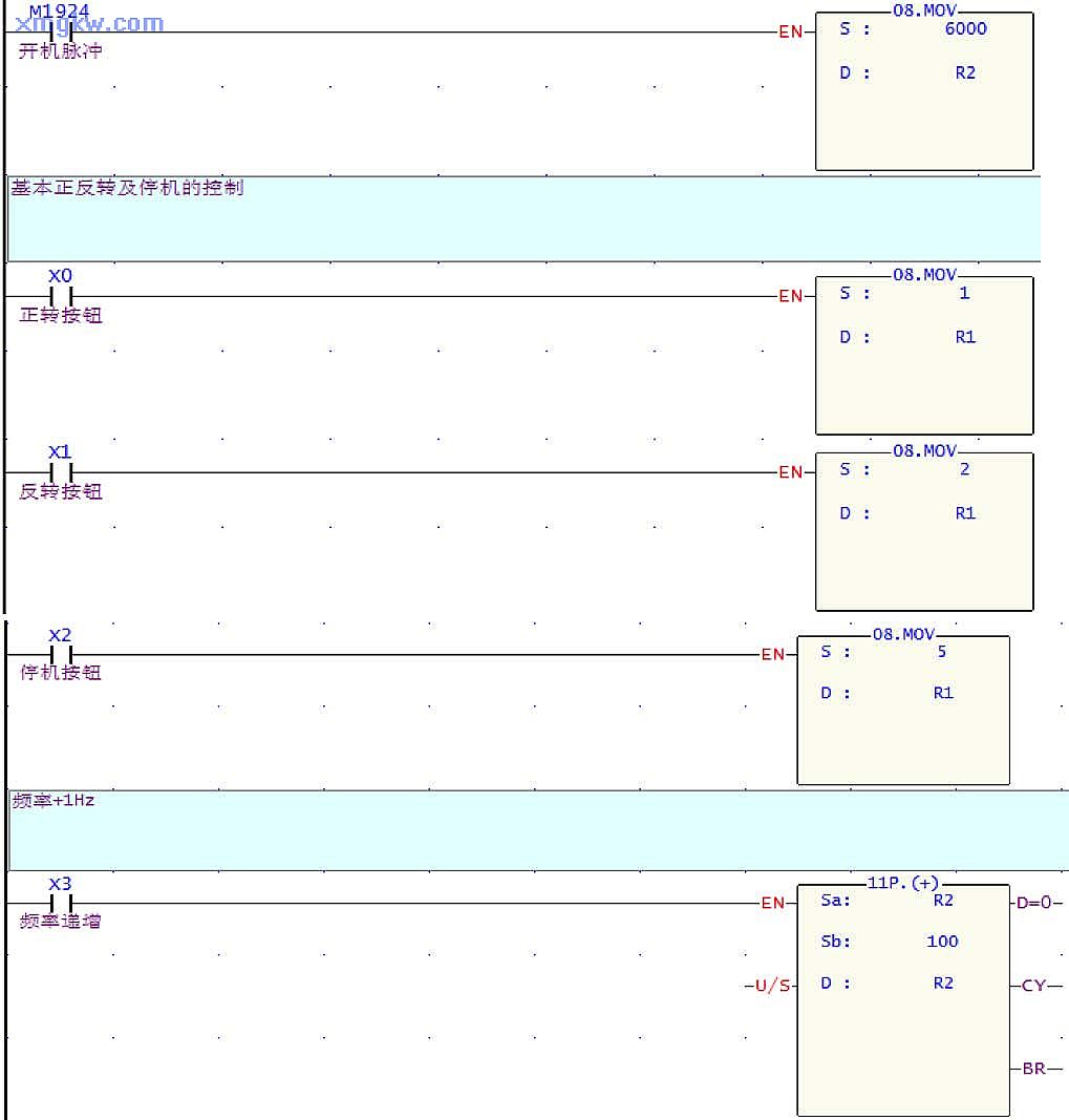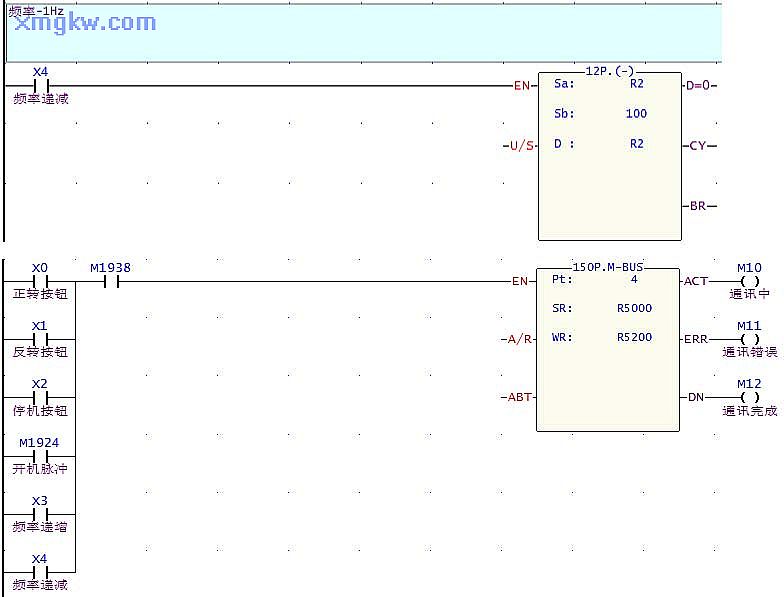 z設置變頻器主頻率為 60Hz正方向啟動(dòng)。z讀取英威騰 CHE100系列變頻器運行頻率和設定頻率,并將其分別存于 D0、D1中。z遠程手動(dòng)微調頻率,以 1Hz為單位。