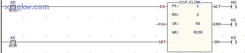 【控制要求】按X0↑,啟動(dòng)FUN151.CLINK,MD2通訊控制指令進(jìn)入接受數據狀態(tài)按X1則放棄接受,亦即關(guān)閉此命令。【必要參數設置】