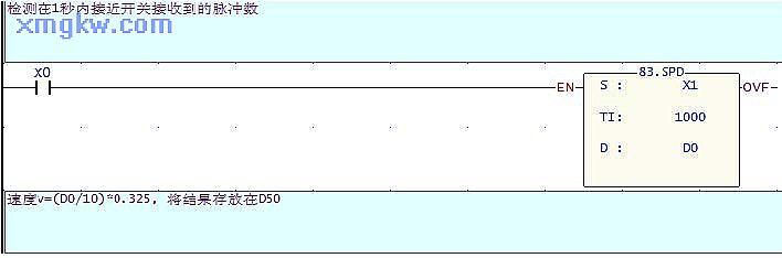 SPD 指令測得的接近開(kāi)關(guān)的脈沖頻率( D0)來(lái)計算出電機的轉速。電機轉速 (r/min)=每分鐘內測得的脈沖數目 /10=(脈沖頻率 ×60)/10=(D0×60)/10。