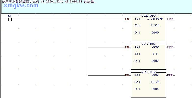 - X1=ON,運算開(kāi)始執行,首先將浮點(diǎn)數 1.236與1.324相加,結果存放于 D100。