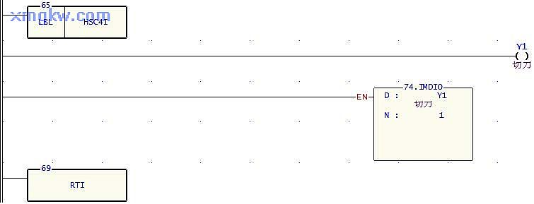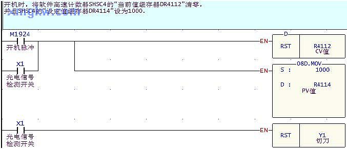- SHSC4計數達到 1000時(shí)(即傳送帶滾軸轉動(dòng) 1000轉),以中斷的方式立即將 Y1的狀態(tài)輸出到外部輸出端,使切刀下切。