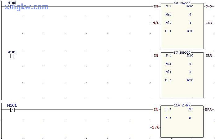 M101= ON,執行 DECOD指令,設置 D10的值, D10的值會(huì )被譯碼到 Y0~Y7中之一,從而使對應的輔助流水線(xiàn)暫停,例如, D0=5,則譯碼得到 Y5=ON,編號 5的輔助流水線(xiàn)將暫停運行;當 M101=OFF, Z-WR指令執行, Y0~Y7都為OFF,所有的流水線(xiàn)都正常運行。