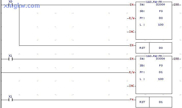 2. X1=ON,將編號為 0~99的檔案緩存器的 100筆數據讀出到 D3000~D3099。 【元件說(shuō)明】