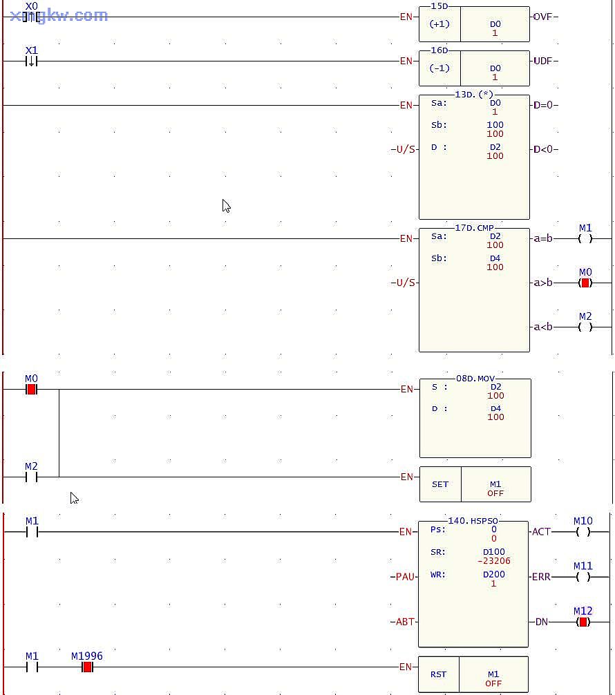 作為絕對定位的目標位置值,同時(shí) M1被置位為 On,Fun.140指令執行,系統從上次位置( D4=100)跑到目標位置( D4=D2=200),再次左移 1mm。依此類(lèi)推,右移的情況與此相似,只要有按下右移寸動(dòng)開(kāi)關(guān)一次,將右移 1mm。