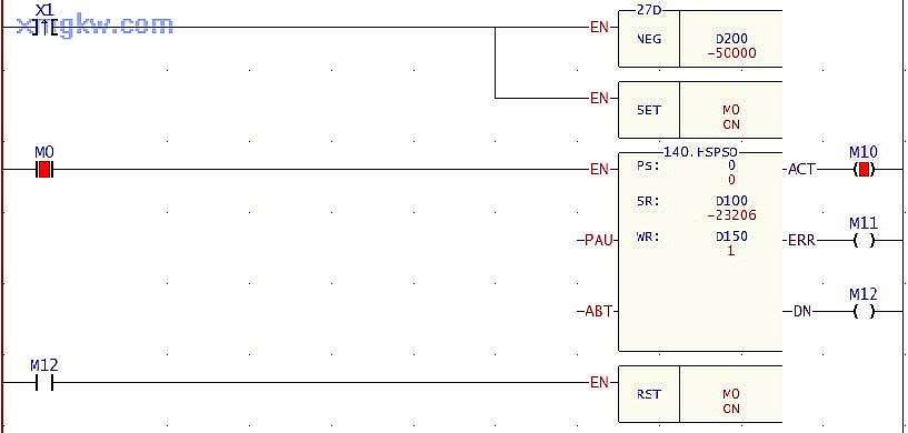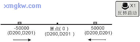 【控制要求】某定位控制系統做左右位移運動(dòng),每按下一次按鈕( X1),定位裝置從當前位置反轉移動(dòng)到以原點(diǎn)( D200, D201值為0)為對稱(chēng)中心的另一邊。