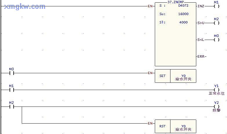 【控制要求】大型公用水塔利用模擬式液位高度測量?jì)x (0~10V電壓輸出 )測量水位高度,以便對水位進(jìn)行控制。當檢測水位處于正常高度時(shí),水位正常指示燈亮;當檢測水塔只剩余 1/4水量時(shí),開(kāi)始給水;當檢測水位到達上限時(shí),報警并停止給水。
