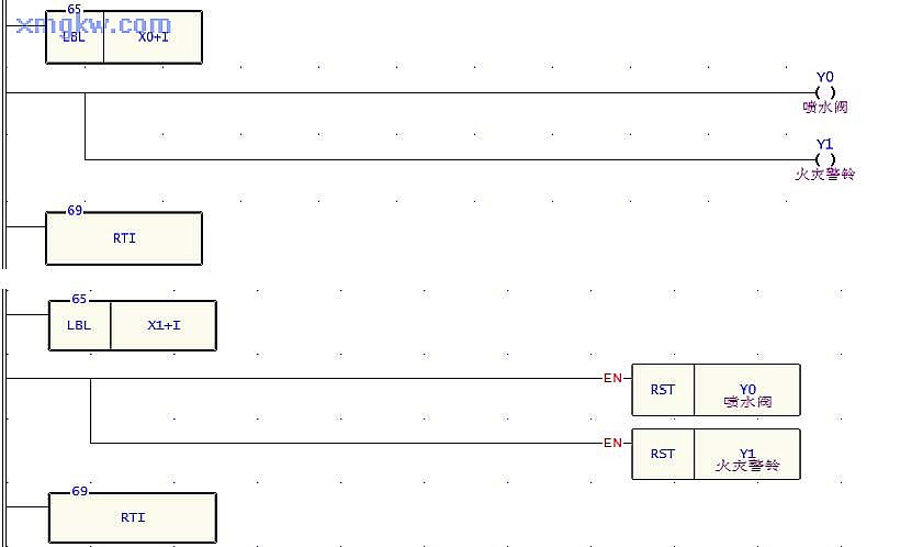 當警報解除時(shí),按下警報解除按鈕, X1由OFF→ON變化,PLC 立即停止主程序執行,轉而執行中斷子程序“X1+I”,關(guān)閉噴水閥( Y0)和警鈴( Y1);“ X1+I”執行完畢后,再返回主程序從斷點(diǎn)處繼續往下執行。