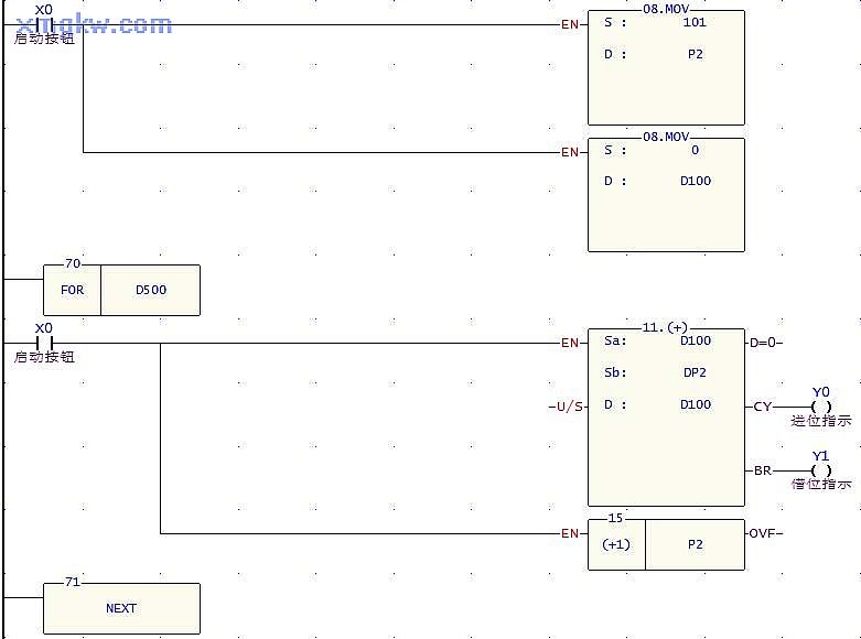 當相加結果數值小于 -32768時(shí),BR接通,輸出線(xiàn)圈Y1導通,借位指示燈亮;當相加結果數值大于 32767時(shí),CY接通,輸出線(xiàn)圈 Y0導通,進(jìn)位指示燈亮。