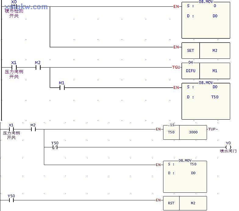 顧客投錢(qián)后握住噴水器開(kāi)關(guān)柄, X1=ON,DIFU指令被執行, M1接通一個(gè)掃描周期,先使 T50清零,使T50從零開(kāi)始計時(shí) 5 分鐘(T50=3000),此時(shí), Y0=ON,允許水打開(kāi)噴出閥。