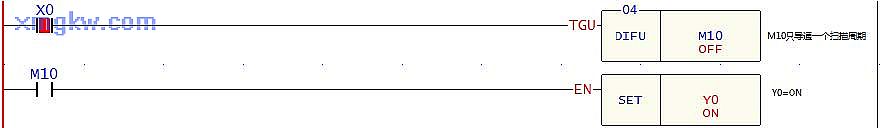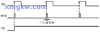 開(kāi)關(guān)由 OFF→ON動(dòng)作時(shí)產(chǎn)生一個(gè)掃描周期的脈沖 M10,作為條件去觸發(fā)指示燈或其他裝置?!窘M件說(shuō)明】