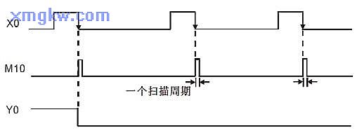 【控制要求】 開(kāi)關(guān)由 ON→OFF動(dòng)作時(shí)產(chǎn)生一個(gè)掃描周期的脈沖 M10,作為條件去觸發(fā)指示燈或其他裝置。